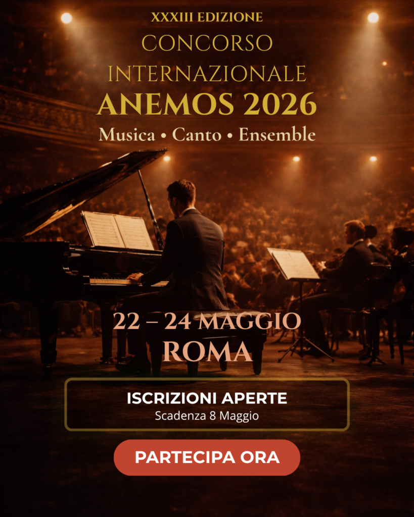 IT | EN Italiano Il XXXIII (33°) Concorso Internazionale ANEMOS – Vocale e Strumentale è dedicato alla promozione della musica classica e alla valorizzazione dei giovani interpreti.Attivo dal 1993, il Concorso rappresenta un appuntamento di riferimento per solisti, cantanti lirici e formazioni cameristiche provenienti dall’Italia e dall’estero. L’edizione 2026 si svolgerà a Roma, presso il […]